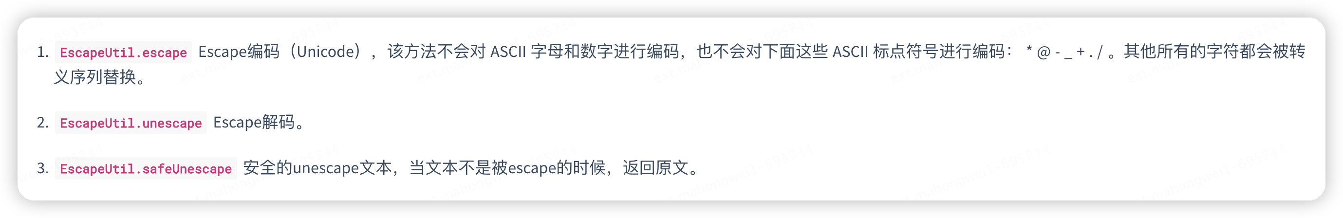 # ❓背景 灵魂拷问 1:还在为新项目工具类搬迁而烦恼? 灵魂拷问 2:还在为项目中工具类维护而烦恼?  # 📘简述 `**Hutool**`它是一个 Java 工具集类库,包含了很多静态方法的封装:流处理、时间日期处理、正则处理、加解密处理、文件处理、集合处理等,可以说是项目中几乎所有 XxxxUtil 的替代品,它可以使你更多的关注代码逻辑,优雅的写出高效代码,避免 “复制粘贴,改改再战”。 # ”🛠️组件 模块划分预览,可以根据需求对每个模块单独引入,也可以通过引入`hutool-all`方式引入所有模块。 | 模块 | 介绍 | | --- | --- | | hutool-aop | JDK 动态代理封装,提供非 IOC 下的切面支持 | | hutool-bloomFilter | 布隆过滤,提供一些 Hash 算法的布隆过滤 | | hutool-cache | 简单缓存实现 | | **hutool-core** | **核心,包括 Bean 操作、日期、各种 Util 等** | | hutool-cron | 定时任务模块,提供类 Crontab 表达式的定时任务 | | **hutool-crypto** | **加密解密模块,提供对称、非对称和摘要算法封装** | | hutool-db | JDBC 封装后的数据操作,基于 ActiveRecord 思想 | | hutool-dfa | 基于 DFA 模型的多关键字查找 | | hutool-extra | 扩展模块,对第三方封装(模板引擎、邮件、Servlet、二维码、Emoji、FTP、分词等) | | **hutool-http** | **基于 HttpUrlConnection 的 Http 客户端封装** | | hutool-log | 自动识别日志实现的日志门面 | | hutool-script | 脚本执行封装,例如 Javascript | | hutool-setting | 功能更强大的 Setting 配置文件和 Properties 封装 | | hutool-system | 系统参数调用封装(JVM 信息等) | | hutool-json | JSON 实现 | | hutool-captcha | 图片验证码实现 | | hutool-poi | 针对 POI 中 Excel 和 Word 的封装 | | hutool-socket | 基于 Java 的 NIO 和 AIO 的 Socket 封装 | | hutool-jwt | JSON Web Token (JWT) 封装实现 | # ☀️常用 ⚠️**只列举部分方法,详细可查看源码学习!!!** ## 1、核心工具集 ### 1.1、日期时间工具 - DateUtil > 日期转换再常用不过了,字符串转日期格式、日期格式转指定字符串格式、获取当前系统日期、时间差 ``` // 自定义日期格式转化 String dateStr = "2017-03-01"; Date date = DateUtil.parse(dateStr, "yyyy-MM-dd"); ``` ### 1.2、农历日期 - ChineseDate > 提供了生肖、天干地支、传统节日等方法。 ``` //通过公历构建 ChineseDate date = new ChineseDate(DateUtil.parseDate("2020-01-25")); // 一月 date.getChineseMonth(); // 正月 date.getChineseMonthName(); // 初一 date.getChineseDay(); // 庚子 date.getCyclical(); // 生肖:鼠 date.getChineseZodiac(); // 传统节日(部分支持,逗号分隔):春节 date.getFestivals(); // 庚子鼠年 正月初一 date.toString(); ``` ### 1.3、计时器工具 - TimeInterval > 计算方法或过程执行的时间,支持分组计时,方便对比时间 ``` TimeInterval timer = DateUtil.timer(); //--------------------------------- //-------这是执行过程 //--------------------------------- timer.interval();//花费毫秒数 timer.intervalRestart();//返回花费时间,并重置开始时间 timer.intervalMinute();//花费分钟数 ``` ### 1.4、文件类型判断 - FileTypeUtil > 在文件上传时,有时候我们需要判断文件类型。但是又不能简单的通过扩展名来判断(防止恶意脚本等通过上传到服务器上),于是我们需要在服务端通过读取文件的首部几个二进制位来判断常用的文件类型。 ``` File file = FileUtil.file("d:/test.jpg"); String type = FileTypeUtil.getType(file); //输出 jpg则说明确实为jpg文件 Console.log(type); ``` ### 1.5、符串工具 - StrUtil > 这个工具的用处类似于 [Apache Commons Lang](https://www.oschina.net/action/GoToLink?url=http%3A%2F%2Fcommons.apache.org%2F) 中的 StringUtil,字符串判空操作就不再累述,StrUtil 只做增强:sub、removePrefix、removeSuffix ``` // 去掉字符串的后缀,例如去个文件名的扩展名。 String fileName = StrUtil.removeSuffix("pretty_girl.jpg", ".jpg") //fileName -> pretty_girl ``` ### 1.6、16 进制工具 - HexUtil > 16 进制一般针对无法显示的一些二进制进行显示,常用于: 1、图片的字符串表现形式 2、加密解密 3、编码转换 ``` String str = "我是一个字符串"; String hex = HexUtil.encodeHexStr(str, CharsetUtil.CHARSET_UTF_8); //hex是: //e68891e698afe4b880e4b8aae5ad97e7aca6e4b8b2 String decodedStr = HexUtil.decodeHexStr(hex); //解码后与str相同 ``` ### 1.7、Escape 工具 - EscapeUtil > 转义和反转义工具类 Escape / Unescape。escape 采用 ISO Latin 字符集对指定的字符串进行编码。所有的空格符、标点符号、特殊字符以及其他非 ASCII 字符都将被转化成 % xx 格式的字符编码 (xx 等于该字符在字符集表里面的编码的 16 进制数字)。此类中的方法对应 Javascript 中的 `escape()` 函数和 `unescape()` 函数。  ### 1.8、URL 工具 - URLUtil > URL(Uniform Resource Locator)中文名为统一资源定位符,有时也被俗称为网页地址。表示为互联网上的资源,如网页或者 FTP 地址。在 Java 中,也可以使用 URL 表示 Classpath 中的资源(Resource)地址。 • `URLUtil.normalize` 标准化化 URL 链接。对于不带 http:// 头的地址做简单补全。 ``` String url = "http://www.hutool.cn//aaa/bbb"; // 结果为:http://www.hutool.cn/aaa/bbb String normalize = URLUtil.normalize(url); url = "http://www.hutool.cn//aaa/\\bbb?a=1&b=2"; // 结果为:http://www.hutool.cn/aaa/bbb?a=1&b=2 normalize = URLUtil.normalize(url); ``` • `URLUtil.encode` 封装`URLEncoder.encode`,将需要转换的内容(ASCII 码形式之外的内容),用十六进制表示法转换出来,并在之前加上 % 开头。 ``` String body = "366466 - 副本.jpg"; // 结果为:366466%20-%20%E5%89%AF%E6%9C%AC.jpg String encode = URLUtil.encode(body); ``` ### 1.9、枚举工具 - EnumUtil > 枚举(