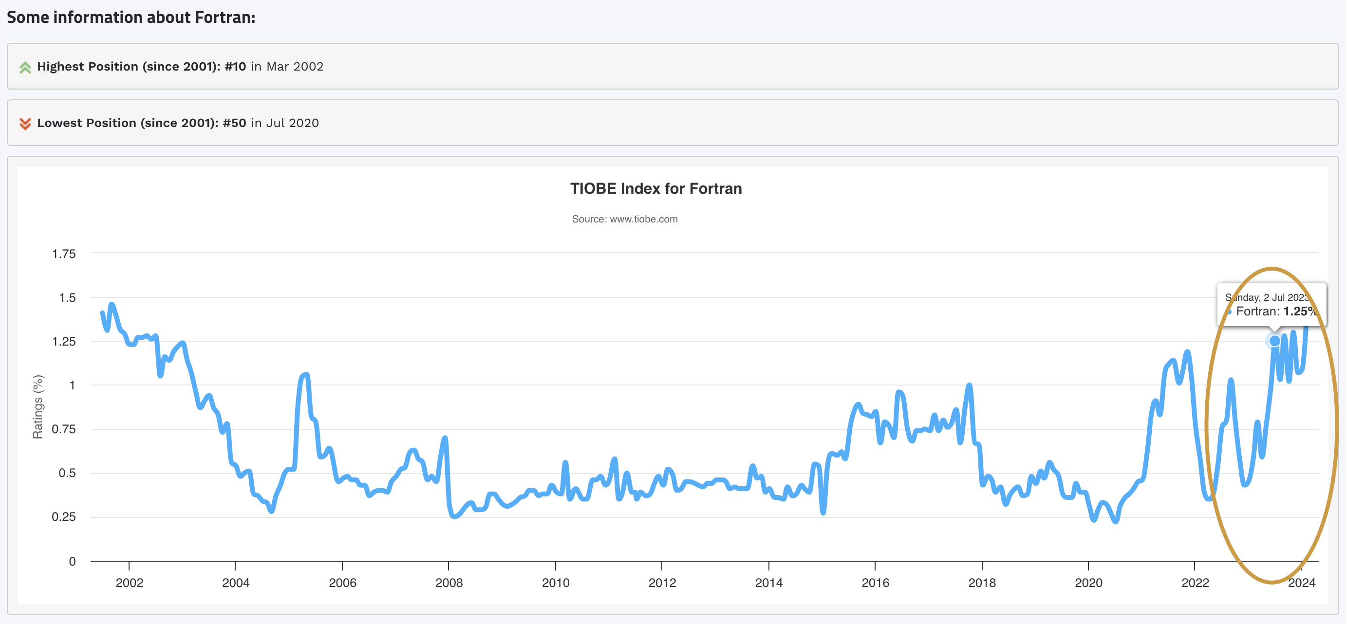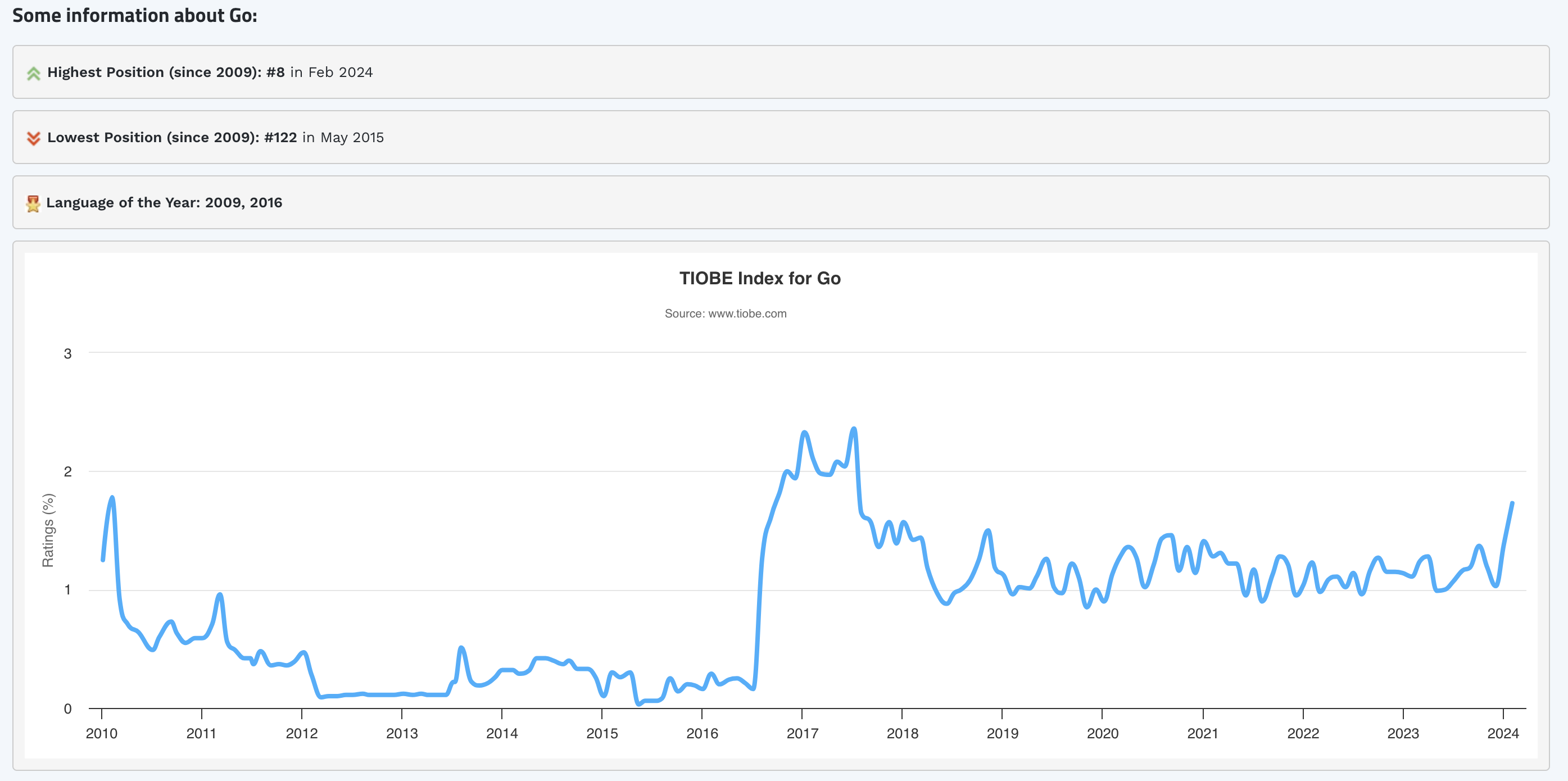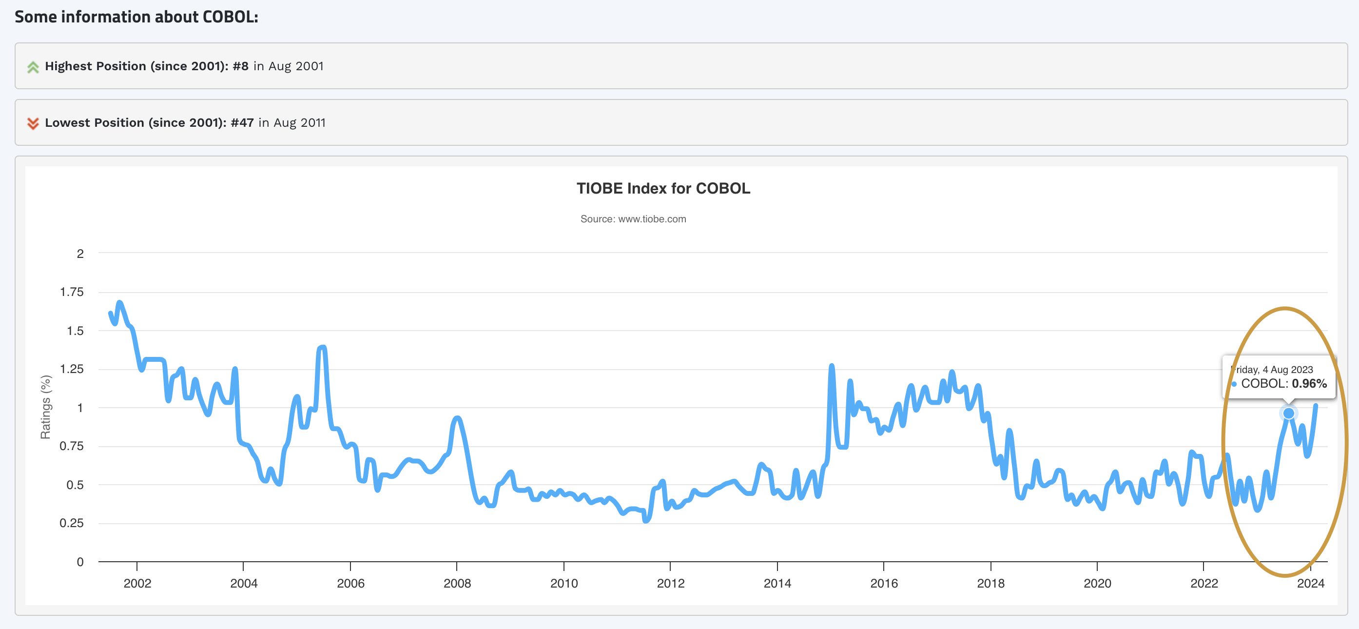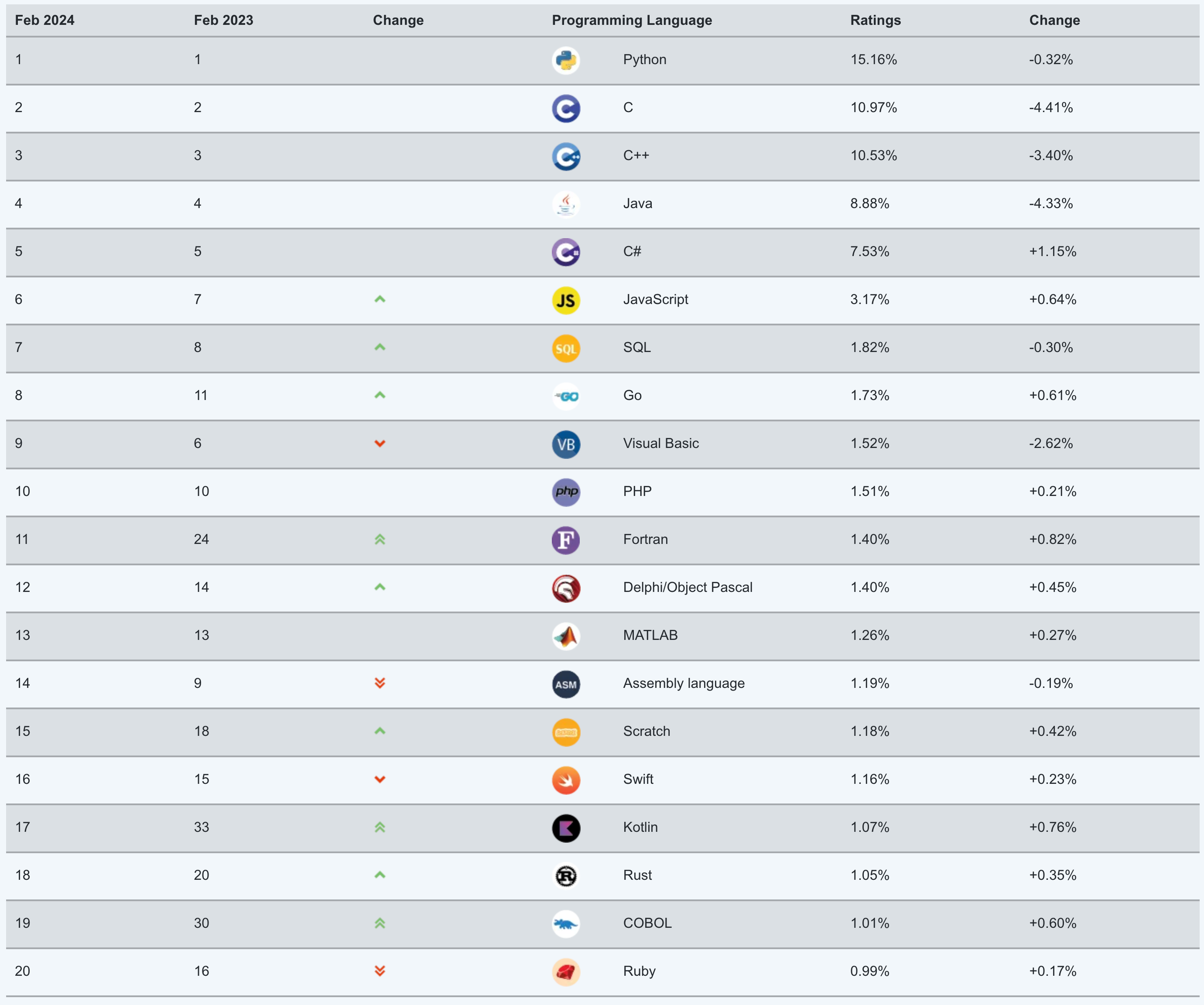 来源: OSCHINA 2024-02-17 19:07:00 [2023 大语言模型技术报告.pdf ](https://talk.gitee.com/report/china-open-source-2023-llm-report.pdf?fr=newsdetail) TIOBE 编程语言排行榜公布了最新的 2 月榜单: _[https://www.tiobe.com/tiobe-index/](https://www.oschina.net/action/GoToLink?url=https%3A%2F%2Fwww.tiobe.com%2Ftiobe-index%2F)_ 2024 年 2 月,Go 进入了 TIOBE 编程语言排行榜前十,**排名第 8 位 —— 这是 Go 有史以来的最高排名**。从其排名趋势变化图来看,Go 排名最低是 2015 年的第 122 位。  除了 Go 语言,本月的榜单有两门“上古语言” 罕见地进入了前 20: - Fortran 从去年同期的第 24 位上升至**第 11 位**,PHP 在其前一位 - COBOL 从去年同期的第 30 位上升至**第 19 位**,紧随大热的 Rust 其后   根据这两门语言排名的趋势变化,它们的排名于去年中旬突然出现爆发式上升,此后虽然稍有下降,但也比前几年靠前。 去年 8 月,IBM [推出](https://www.oschina.net/news/255047/ibm-ai-translate-cobol-code-to-java)了一款生成式 AI 编程助手 watsonx,用于将传统的 COBOL 转换为企业级 Java 代码。据称该工具由 IBM 的 watsonx.ai 代码模型提供支持。该模型从 1.5 万亿个 tokens 中学习了 115 种编码语言的知识;拥有 200 亿个参数,从而实现“更高效的 COBOL 到 Java 转换”。  COBOL 是最古老的编程语言之一,历史可以追溯到 1959 年左右;但当下仍被大型组织广泛用于处理来自重要中央系统的数据,例如账单、帐户、工资单和客户交易等。2022 年的一项调查指出,92% 的受访者认为 COBOL 具有战略意义,日常使用的 COBOL 代码量显着增加至 775-8500 亿行;大约是先前估计的三倍。 展开阅读全文