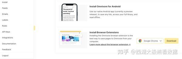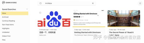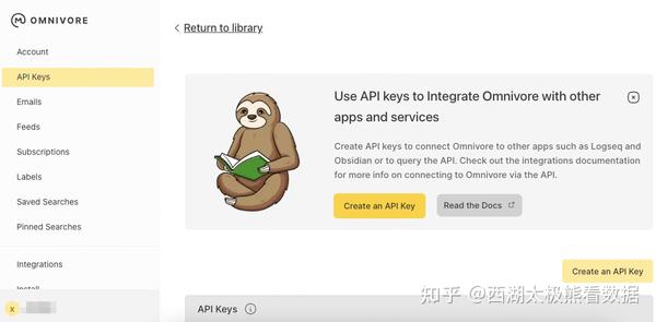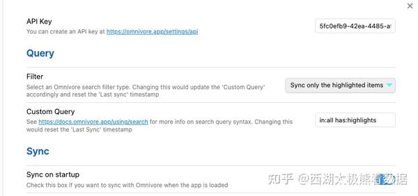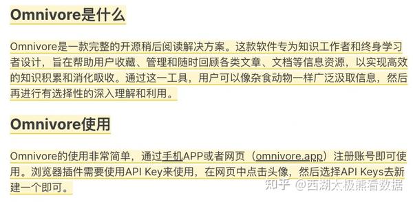 在过去对于阅读过的文章,读完也就过去了,并没有保存下来链接,以至于要用的时候,又要重新去寻找,有时候更本就不记得,也就找不到了,非常影响学习效率。 在开始使用Obsidian进行知识管理以后,开始尝试保存阅读过的链接,以方便想回顾学习的时候,可以随时找到,但是,新的问题也出现了,每次都要通过复制粘贴来保存链接,非常繁琐,并且阅读记录一多,也不方便查找。 因此,希望能够有更好的办法满足对于阅读内容的管理,最好能满足如下几个主要的需求: - **一键保存**:不用复制粘贴,像微信阅读公众号文章一样点一些收藏就行; - **分类管理**:对于不同类型的文章如数据分析、知识管理、生活健康等,可以实现分类保存; - **划提重点**:对于每篇文章中认为不懂、或者重点内容进行重点标记且可以一键提取出来,方便未来二次加工; - **集中管理**:最终都汇集到Obsidian进行集中管理和加工,不希望在多个软件或者平台来回操作管理; 基于以上需求,尝试寻找了各种方法,有的不是太复杂,就是根本无法完全满足以上需求,有的可以满足大部分,可是又要收费。 我始终坚信,不是我一个人有这样的需求,有需求就一定会有人去实现,最终,发现Omnivore满足了所有需求,真正可以实现Obsidian和Omnivore一键联动剪藏文章,更可贵的是完全开源免费。 ## 安装配置 下面详细来说一下如何实现联动配置,步骤如下: 1. Web注册登录Omnivore 2. 创建APIKey 3. 下载安装Obsidian插件Omnivore配置联动 4. Web下载安装Omnivore扩展程序插件 ### **1、Web注册登录Omnivore** 通过网页地址[omnivore.app](https://link.zhihu.com/?target=http%3A//omnivore.app/)进入Web端Omnivore主页,第一次登录还是要进行注册,通过邮箱注册,注册成功后,会发送激活邮件到邮箱,点击激活即可进入页面。如下图:  ### **2、创建APIKey** 由于要和Obsidian进行联动,必须要先创建一个APIKey,点击左下角账号名称,会出现如下图:  然后,点击API Keys进入创建页面如下:  点击Create API Key进入如下页面:  对其简单命名如:obsidian,然后会生成一个key。复制粘贴保存好。 ### **3、下载安装Obsidian插件Omnivore配置联动** 在配置联动之前,也需要先在Obsidian插件市场下载Omnivore插件,安装好打开设置界面,如下图在API key中填入上面创建的key。  然后,建议配置处再修改一处,在上图Filter处选择同步高亮部分,因为Omnivore在剪藏后可以对文章进行高亮标注,因此,重点对高亮部分进行同步,相对更聚焦重点内容,不会每次都对所有看过的文章进行同步,这样太冗余了。 ### **4、Web下载安装Omnivore插件** 对应网页端要想实现剪藏功能,最后一步,还必须下载相应的扩展程序,点击左下角账号,再如下图选择install,即可看到下图右边的download按钮,下载即可,但是有时候由于网络问题很难打开,有需要此插件的可以WX(西湖太极熊数据分析)关注后,发送:Omnivore插件,**会免费提供**。  下载好,打开浏览器扩展程序开发者模式,拖拽Omnivore插件到其中即可。 以上就对剪藏主要配置已全部完成,接下来重点是如何使用和管理。 ## **Omnivore使用** 在配置好以后,开始对已经阅读的文章,或者对来不及稍后会阅读的文章进行剪藏操作,以及需要的一些基础管理操作如下: ### 1、一键剪藏 当浏览某网页的时候,打开扩展程序,如下图:  点击后如下图:  然后,点击Omnivore即完成了文章剪藏。在Omnivore可以进行查看如下:  ### 2、标签设置 直接在Omnivore左侧导航栏点击Labels即可看到如下图,创建标签,如:数据分析、阅读等,在剪藏文章直接点击标签即可给每个文章打标,方便管理。  ### 3、高亮打标 打开剪藏文章,直接选中,即可进行高亮颜色打标,如下图:  当同步到Obsidian的时候, 如果有设置同步高亮部分,就只会同步高亮部分内容,不会总是同步所有文章,方便管理和进一步内化学习。 ### 4、Obsidian一键同步 一切配置好之后,每天打开点击Obsidian左侧Omnivore图标即可同步最新高亮文章内容到Obsidian进行统一管理。点击如下图:  ## 总结 对于移动端IOS同样可以实现此功能,下载插件即可,但是,对于安卓系统暂时还没有完全的app,有相对复杂的方法安装,建议还是先通过网页使用起来,即使手机端有好的文章,直接发到网页端先保存好,待有了app再使用起来。 对于剪藏功能只是一个工具,帮助你更高效的管理文章,不要耗费太多精力在文章保存上,更多的思考要在对好文进行内化吸收上,为自己所用的内容才有价值。 \--END--