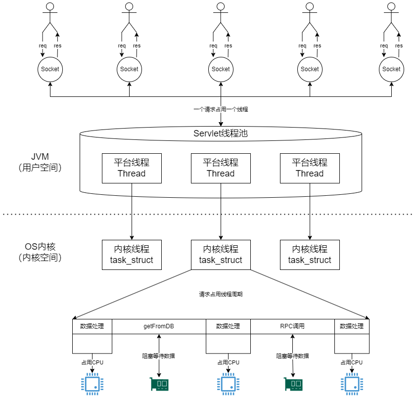 虚拟线程是由Java运行时而不是操作系统实现的Java线程,和传统线程(或称之为平台线程)之间的主要区别在于,我们可以很容易地在同一个Java进程中运行大量活动的虚拟线程,甚至数百万个。大量的虚拟线程赋予了它们强大的功能:通过允许服务器并发处理更多的请求,它们可以更有效地运行以thread-per-request(每个请求一个线程)的方式编写的服务器应用程序,从而实现更高的吞吐量和更少的硬件浪费。 一直听闻Java虚拟线程的“威名”很久了,于是最近做个人项目的时候便尝试使用JDK21进行开发,研究一下所谓的虚拟线程的原理与实现。技术水平有限,欢迎一起交流探讨~  背景 引入虚拟线程是为了减少编写、维护和观察**高吞吐量并发应用程序的工作量**。 对于应用提供的接口,其响应时间一定,那么此时其吞吐量与应用程序能够同时处理的请求数量(即并发数量)成正比。假设一个接口的响应耗时为50ms,而应用程序可以同时并发处理10个请求,那么每秒就有200(1s/50ms\*10)个请求的吞吐量。此时如果应用程序可以将并发处理请求的能力提升到100,那么每秒则能达到2000的吞吐量。**显然提高并发处理的线程数可以显著提高应用的吞吐量**,然而Java中平台线程是昂贵的资源,默认每个平台线程消耗1MB栈内存,即 JVM 中运行的平台线程数量有上限。此外操作系统对于支持的最大线程也是有限制的,并不能无限制的增加内核线程的数量。下图为系统支持的最大线程数:  在大多数JVM的实现中,Java线程是和操作系统线程是一对一映射的(如下图),如果我们使用thread-per-request的形式(常见的如Tomcat、Jetty都是这样的模型),即为每个请求创建一个线程进行处理,那么很快便会到达操作系统线程数上限。  **如果请求是IO密集型,那么大多线程都是处于阻塞等待IO返回的情况,会出现线程资源已经耗尽,而CPU利用率却很低。**因此,若一个平台线程专用于用户请求,对高并发用户的应用程序,就非常容易出现线程池打满,后续请求进入阻塞的情况。 一些希望充分利用硬件的开发人员放弃了thread-per-request的形式,转而采用响应式编程。即请求处理代码不是从头到尾都在一个线程上进行,而是在等待 I/O 操作完成时将其线程返回到池中,以便线程可以为其他请求提供服务。这种细粒度的线程共享**(在这种共享中,代码仅在线程执行计算时保留在线程上,而不是在等待 I/O 时保留线程)**允许大量并发操作,而不会长时间占用线程。 然而这种方式虽然消除了操作系统线程稀缺性对吞吐量的限制,但它显著提高程序的理解成本和调试成本。它采用一组单独的 I/O 方法,这些方法不等待 I/O 操作完成,而是稍后向回调发出完成信号。开发人员必须将其请求处理逻辑分解为小阶段,然后将它们组合到一个顺序管道中。在响应式编程中,请求的每个阶段都可能在不同的线程上执行,并且每个线程都以交错方式运行属于不同请求的阶段,这种方式非常的复杂,创建响应式通道、调试以及理解它们的执行流程都非常的困难,更别说遇到异常时的排查。  虚拟线程的引入解决了上述的问题。**Java 运行时以一种切断 Java 线程与操作系统线程的一对一对应关系的方式来实现 Java 线程,即虚拟线程。**正如操作系统通过将大型虚拟地址空间映射到有限数量的物理 RAM 来给人一种内存充足的错觉一样,**Java 运行时可以通过将大量虚拟线程映射到少量的操作系统线程来给人一种线程充足的错觉**。 平台线程 (java.lang.Thread) 是以传统方式实现的实例,作为操作系统线程的薄包装器,与系统线程一一映射,而**虚拟线程不绑定到特定操作系统线程的实例**。**“thread-per-request”样式的应用程序代码可以在请求的整个持续时间内在虚拟线程中运行,但虚拟线程仅在 CPU 上执行计算时使用操作系统线程**。虚拟线程具备与异步样式相同的可伸缩性,只是它的实现是透明的,不需要我们额外的理解和开发成本。**当在虚拟线程中运行的代码进行阻塞的 I/O 操作时,运行时将自动挂起虚拟线程,直到以后可以恢复为止。**对于 Java 开发人员来说,虚拟线程只是创建成本低廉且几乎无限丰富的线程。硬件利用率接近最佳状态,允许高并发性,从而实现高吞吐量,同时应用程序与 Java 平台及其工具的多线程设计保持和谐。   实现 #### **▐** **定义** **与平台线程一样,虚拟线程也****是 java.lang.Thread 的****一个实例,但是虚拟线程不绑定到特定的操作系统线程。**虚拟线程仍在操作系统线程上运行代码,区别是当虚拟线程上运行的代码调用阻塞 I/O 操作时,Java 运行时会将其挂起直到它可以恢复,与挂起的虚拟线程关联的操作系统线程此时可以自由地对其他虚拟线程执行操作。 虚拟线程的实现方式与虚拟内存类似。为了模拟大量内存,操作系统将一个大的虚拟地址空间映射到有限的 RAM。同样,为了模拟大量线程,Java 运行时将大量的虚拟线程映射到少量的操作系统线程。 **与平台线程不同,虚拟线程通常具有较浅的调用堆栈**,通常只执行一次 HTTP 客户端调用或一次 JDBC 查询。尽管虚拟线程支持线程局部变量(ThreadLocal)和可继承的线程局部变量(InheritedThreadLocal),我们应该仔细考虑使用它们,因为单个 JVM 可能支持数百万个虚拟线程。 **虚拟线程适用于运行那些大部分时间是被阻塞着的任务,即 IO 密集型操作,而不适用于长时间运行的 CPU 密集型操作。**因为虚拟