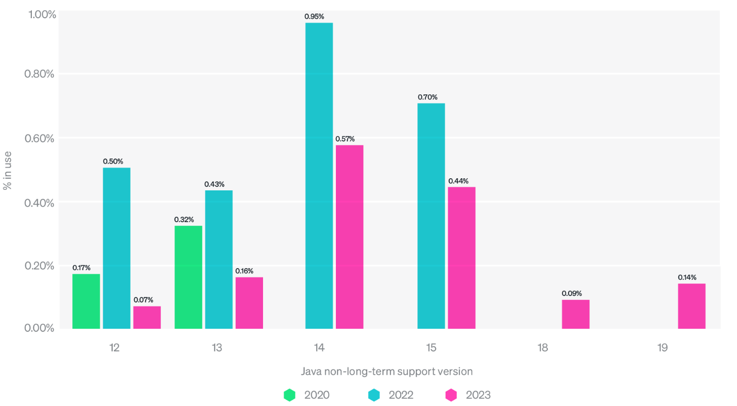 New Relic 最新发布了一份 “[2023 年 Java 生态系统状况报告](https://www.oschina.net/action/GoToLink?url=https%3A%2F%2Fnewrelic.com%2Fresources%2Freport%2F2023-state-of-the-java-ecosystem)”,旨在提供有关当今 Java 生态系统状态的背景和见解。该报告基于从数百万个提供性能数据的应用程序中收集的数据,对生产中使用最多的版本、最受欢迎的 JDK 供应商、容器的兴起等多方面进行了调研分析。 #### **Java 17 用户采用率在一年内增长了 430%** Java 每两到三年推出一个长期支持 (LTS) 版本。其中,目前最受欢迎的一个版本是 2018 年 9 月发布的 Java 11;有超过 56% 的应用程序在生产中使用它,高于 2022 年的 48% 和 2020 年的 11% 占比。2014 年发布的 Java 8 紧随其后,近 33% 的应用程序在生产中使用该版本,低于 2022 年的 46%。 报告称,虽然 Java 11 已经连续两年占据榜首,但 Java 17 (2021 年 9 月发布) 的采用率增长远远超过了 Java 11 推出时的情况。现共有超过 9% 的应用程序在生产中使用 Java 17 (2022 年还不到 1%),这意味着其在一年内实现了 430% 的增长率。而 Java 11 花了多年时间才达到接近这个水平的增长。 对 Java 7 (2011 年 7 月发布的 LTS 版本) 的支持已于 2022 年结束,现只有 0.28% 的应用程序仍在生产中使用该版本。大多数使用 Java 7 的应用程序都是尚未升级的遗留应用程序。  #### **Java 14 是最受欢迎的非 LTS 版本** 与 LTS 版本相比,仅支持六个月的非 LTS Java 版本的使用率仍然极低;只有 1.6% 的应用程序使用非 LTS Java 版本,低于 2022 年的 2.7%。其中,于 2020 年 1 月发布的 Java 14 仍然是最受欢迎的非 LTS 版本;使用率为 0.57%,低于 2022 年的 0.95%。Java 15 紧随其后为 0.44%,低于 2022 年的 0.70%。  报告认为,导致非 LTS 版本使用率下降的一些可能因素包括: - 缺乏支持 - 特性的感知吸引力 - 距离下一个 LTS 版本的时间长度 #### **Amazon 是现在最受欢迎的 JDK 供应商** 2020 年,甲骨文是最受欢迎的 JDK 供应商,占据了大约 75% 的市场份额。2022 年,甲骨文虽然保住了第一的市占位置,但其份额已经缩水了近一半,跌至 34%,2023 年还继续下滑到了 28%。New Relic 认为,导致这一现象的主要原因是甲骨文对 Java 11 的限制性许可。此后,该公司对 Java 17 恢复了更加开放的立场。 与此同时,Amazon Corretto 使用率大幅增加成为最常用的 Java 开发工具包,市场份额达到 31%。使得该公司成为最受欢迎的 JDK 供应商,其 2020 和 2022 年的市占分别为 2.18% 和 22%。  报告中的一些其他内容还包括: - 容器化应用程序已成为主流 —— 向 New Relic 报告的 Java 应用中有 70% 是从容器中进行的。 - Garbage-First (G1) 垃圾收集器仍然是使用 Java 11 或更高版本的用户的最爱,有 65% 的使用率。其他在 Java 8 之后出现的实验性垃圾收集器(ZGC 和 Shenandoah)在生产系统中的使用仍然很少。两者都有生产就绪版本,但在一般处理中仍然可以忽略不计。 更多详情可[查看完整报告](https://www.oschina.net/action/GoToLink?url=https%3A%2F%2Fnewrelic.com%2Fresources%2Freport%2F2023-state-of-the-java-ecosystem)。