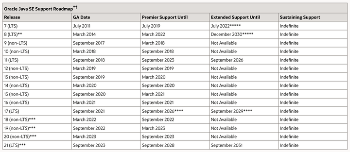 > 2022年,Spring6和 SpringBoot3都推出了,在此之前,Java社区很坚挺,一直是"新版任你发,我用Java 8",不管新版本怎么出,很少有人愿意升级。 这一次,Spring 直接来了个大招,SpringBoot3和Spring6的最低依赖就是JDK17!跨过 JDK 8-16,直接升级到 JDK 17。那么为什么是 JDK 17呢? 作者 | 唐岳平(凌力) 来源 | 阿里开发者公众号 ### 背景 2022年,Spring6和 SpringBoot3都推出了,在此之前,Java社区很坚挺,一直是"新版任你发,我用Java 8",不管新版本怎么出,很少有人愿意升级。 这一次,Spring 直接来了个大招,SpringBoot3和Spring6的最低依赖就是JDK17!跨过 JDK 8-16,直接升级到 JDK 17。那么为什么是 JDK 17呢? ### 为什么是JDK17 这么多新版本的 JDK,而且2022年还会推出 JDK 18 和 JDK 19,为什么 Spring 选择了 JDK 17呢。 主要是因为他是一个 Oracle官宣可以免费商用的LTS版本,所谓 LTS,是 Long Term Support,也就是官方保证会长期支持的版本。  上面这张图是 Oracle 官方给出的 Oracle JDK 支持的时间线。可以看得到,JDK 17 最多可以支持到 2029 年 9 月份。按照技术更新迭代的速度,这次免费商用 8 年可谓是良苦用心,为的就是让使用者放心大胆地将 JDK 升级到 JDK 17(不过JDK 8 支持的时间更长,可以延长到 2030 年 12 月,JDK8可谓是YYDS!) 从 JDK 诞生到现在,还在长期支持的版本主要有 JDK 7、JDK 8 、JDK 11以及 JDK 1,JDK 17 将是继 Java 8 以来最重要的LTS版本,是 Java 社区八年努力的成果。 一直以来,Java8 都是 Java 社区心头的痛,Java8提供了很多特性,比如Lambda 表达式、Optional 类,加上Java8超长的支持时间,都导致了JDK8的使用至今。它代表着以稳定性为主的企业管理层与拥抱变化为主的程序猿之间的拉锯战。不升!成为各大厂心照不宣的选择。现在,这种平衡或将打破。因为 Java 届的霸主框架 SpringBoot,选择了最小支持的 Java lts 版本,就是最新的 Java17。 那么接下来,让我们看看,从JDK8到JDK17,Java 社区八年努力的成果有哪些? ## 从JDK8到JDK17的新特性 ### JDK9新特性(2017年9月) - 模块化 - 提供了List.of()、Set.of()、Map.of()和Map.ofEntries()等工厂方法 - 接口支持私有方法 - Optional 类改进 - 多版本兼容Jar包 - JShell工具 - try-with-resources的改进 - Stream API的改进 - 设置G1为JVM默认垃圾收集器 - 支持http2.0和websocket的API **重要特性:主要是API的优化,如支持HTTP2的Client API、JVM采用G1为默认垃圾收集器** ### JDK10新特性(2018年3月) - 局部变量类型推断,类似JS可以通过var来修饰局部变量,编译之后会推断出值的真实类型 - 不可变集合的改进 - 并行全垃圾回收器 G1,来优化G1的延迟 - 线程本地握手,允许在不执行全局VM安全点的情况下执行线程回调,可以停止单个线程,而不需要停止所有线程或不停止线程 - Optional新增orElseThrow()方法 - 类数据共享 - Unicode 语言标签扩展 - 根证书 **重要特性:通过var关键字实现局部变量类型推断,使Java语言变成弱类型语言、JVM的G1垃圾回收由单线程改成多线程并行处理,降低G1的停顿时间** ### JDK11新特性(2018年9月)(LTS版本) - 增加一些字符串处理方法 - 用于 Lambda 参数的局部变量语法 - Http Client重写,支持HTTP/1.1和HTTP/2 ,也支持 websockets - 可运行单一Java源码文件,如:java Test.java - ZGC:可伸缩低延迟垃圾收集器,ZGC可以看做是G1之上更细粒度的内存管理策略。由于内存的不断分配回收会产生大量的内存碎片空间,因此需要整理策略防止内存空间碎片化,在整理期间需要将对于内存引用的线程逻辑暂停,这个过程被称为"Stop the world"。只有当整理完成后,线程逻辑才可以继续运行。(并行回收) - 支持 TLS 1.3 协议 - Flight Recorder(飞行记录器),基于OS、JVM和JDK的事件产生的数据收集框架 - 对Stream、Optional、集合API进行增强 重要特性:对于JDK9和JDK10的完善,主要是对于Stream、集合等API的增强、新增ZGC垃圾收集器 ### JDK12新特性(2019年3月) - Switch 表达式扩展,可以有返回值 - 新增NumberFormat对复杂数字的格式化 - 字符串支持transform、indent操作 - 新增方法Files.mismatch(Path, Path) - Teeing Collector - 支持unicode 11 - Shenandoah GC,新增的GC算法 - G1收集器的优化,将GC的垃圾分为强制部分和可选部分,强制部分会被回收,可选部分可能不会被回收,提高GC的效率 **重要特性:switch表达式语法扩展、G1收集器优化、新增Shenandoah GC垃圾回收算法** ### JDK13新特性(2019年9月) - Switch 表达式扩展,switch表达式增加yield关键字用于返回结果,作用类似于return,如果没有返回结果则使用break - 文本块升级 """ ,引入了文本块,可以使用"""三个双引号表示文本块,文本块内部就不需要使用换行的转义字符 - SocketAPI 重构,Socket的底层实现优化,引入了NIO - FileSystems.newFileSystem新方法 - ZGC优化,增强 ZGC 释放未使用内存,将标记长时间空闲的堆内存空间返还给操作系统,保证堆大小不会小于配置的最小堆内存大小,如果堆最大和最小内存大小设置一样,则不会释放内存还给操作系统 **重要特性:ZGC优化,释放内存还给操作系统、socket底层实现引入NIO** ### JDK14新特性(2020年3月) - instanceof模式匹配,instanceof类型匹配语法简化,可以直接给对象赋值,如if(obj instanceof String str),如果obj是字符串类型则直接赋值给了str变量 - 引入Record类型,类似于Lombok 的@Data注解,可以向Lombok一样自动生成构造器、equals、getter等方法; - Switch 表达式-标准化 - 改进 NullPointerExceptions提示信息,打印具体哪个方法抛的空指针异常,避免同一行代码多个函数调用时无法判断具体是哪